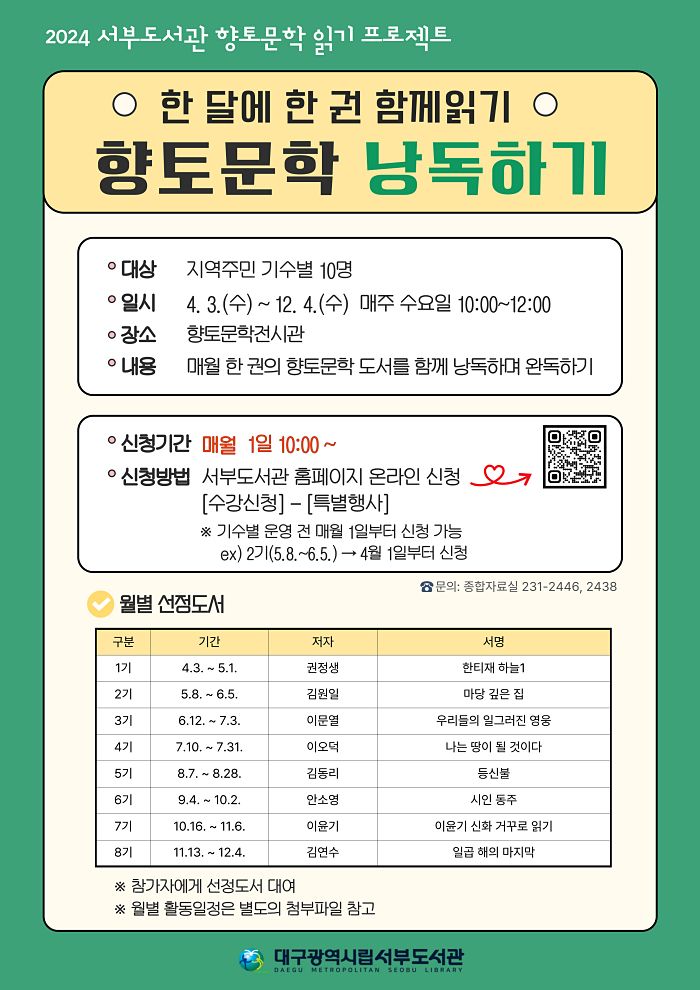 대구서부도서관은 12월까지 도서관 향토문학전시관(지하 1층)에서 ‘한 달에 한 권, 향토문학 낭독하기’를 운영하고 있다.