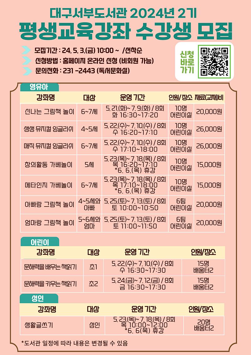 대구서부도서관은 영유아, 초등학생, 성인 등을 대상으로 2기 평생교육강좌 10개를 마련하여, 오는 5월 3일(금)부터 수강생을 모집한다.