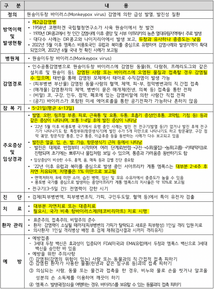 주요증상은 발열, 전신 발진, 두통 등으로 코로나19와는 달리 밀접접촉(피부접촉, 성접촉 등)을 통해 전파되는 특성상 일상적인 접촉으로 발생가능성이 낮으며, 환자 대부분이 자연 회복되고 치료 및 진단 등 대응역량을 확보하고 있어 충분히 관리가 가능한 질환이다.