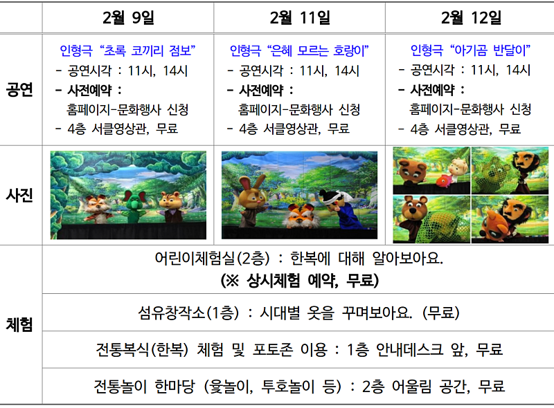 먼저, 2월 9일, 11일, 12일에는 하루 2회(오전 11시, 오후 2시) 인형극이 매일 펼쳐진다. 9일에는 ‘초록 코끼리 점보’, 10일에는 ‘은혜 모르는 호랑이’, 12일 ‘아기곰 반달이’ 공연이 개최된다. 새해를 맞아 새로운 다짐과 용기를 북돋아 주는 작품들과 우리 조상들의 지혜와 해학을 보여주는 이야기들로 구성돼 있다. 인형극 공연은 박물관 홈페이지–문화행사 신청에서 예약 후 이용할 수 있다.