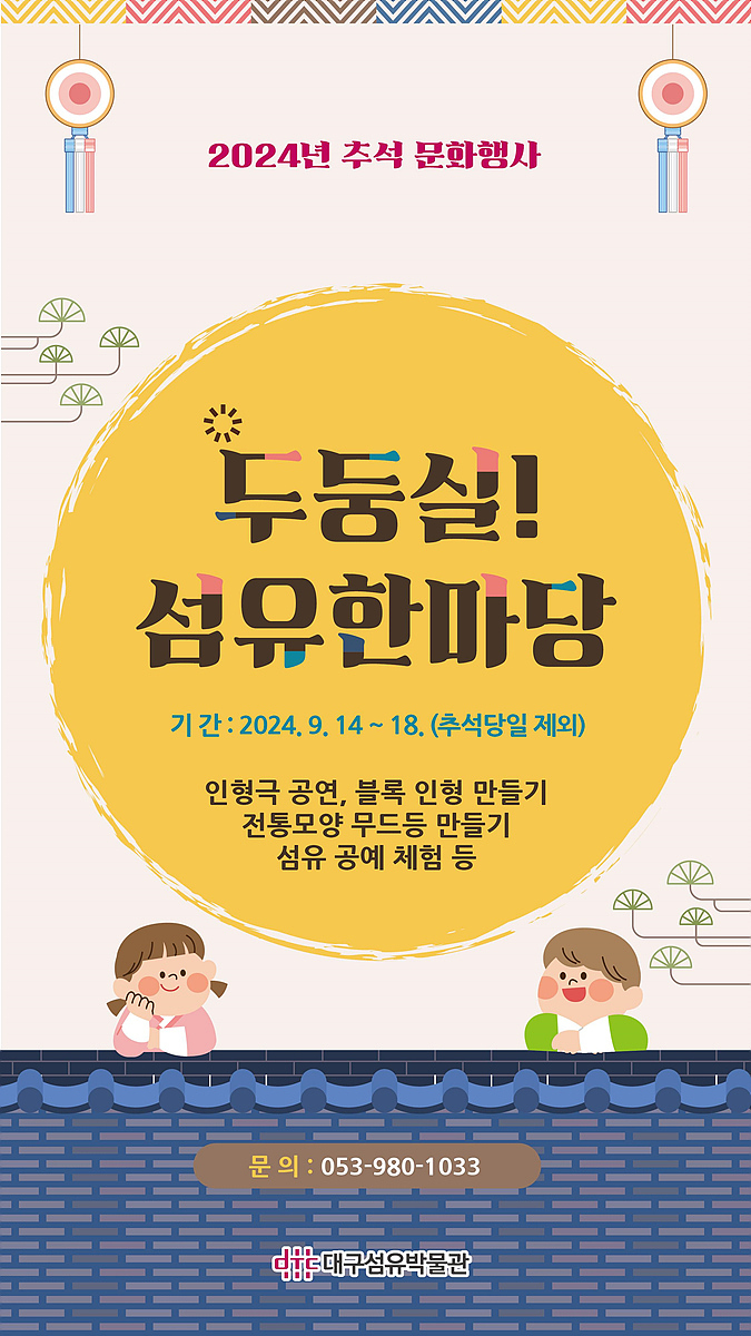 국내 유일의 종합섬유박물관인 대구섬유박물관에서는 추석을 맞아 9월 14일(토)부터 18일(수)까지 인형극 공연, 섬유 공예품 만들기 및 전통놀이 체험 등 다채로운 문화 프로그램을 마련해 관람객들을 맞이한다.