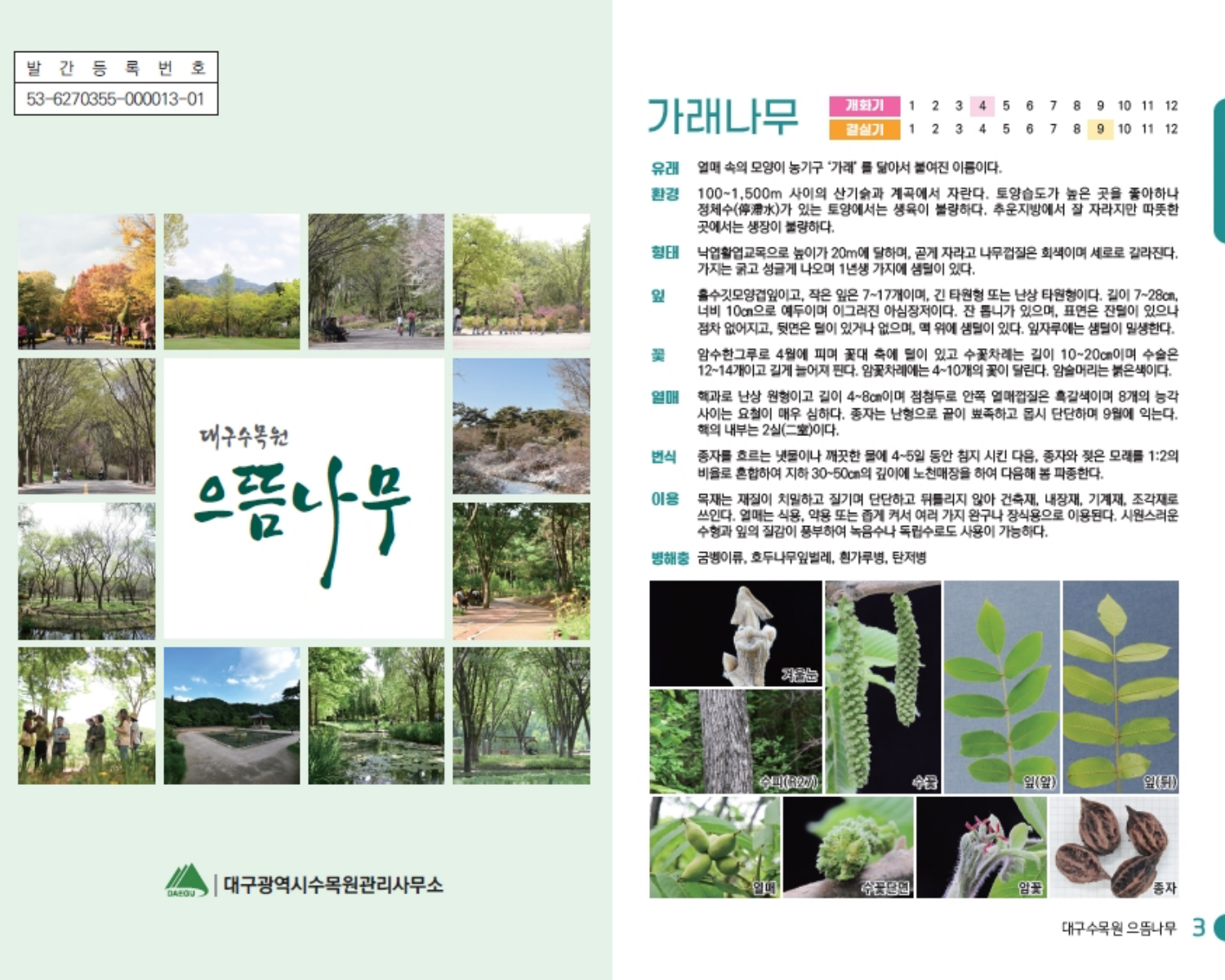 이번에 발간된 ‘대구수목원의 으뜸나무’는 야외에서 편하게 식물공부에 활용할 수 있고 언제 어디서나 들고 다니기 쉬운 크기로 제작이 됐다. 특히 책자에는 나무를 보다 쉽게 찾아보고 이해할 수 있도록 식재위치와 수종별 전경, 꽃, 열매, 잎, 수피, 겨울눈, 종자 등 나무의 부위별 사진 등이 수록되어 있다. 또한 생태·환경적 특성과 나무이름의 유래, 번식 및 이용 방법, 관련 병해충 정보 등의 내용을 일목요연하게 소개해 보다 쉽게 나무의 특징을 이해할 수 있고 오래 기억에 남을 수 있도록 제작됐다.