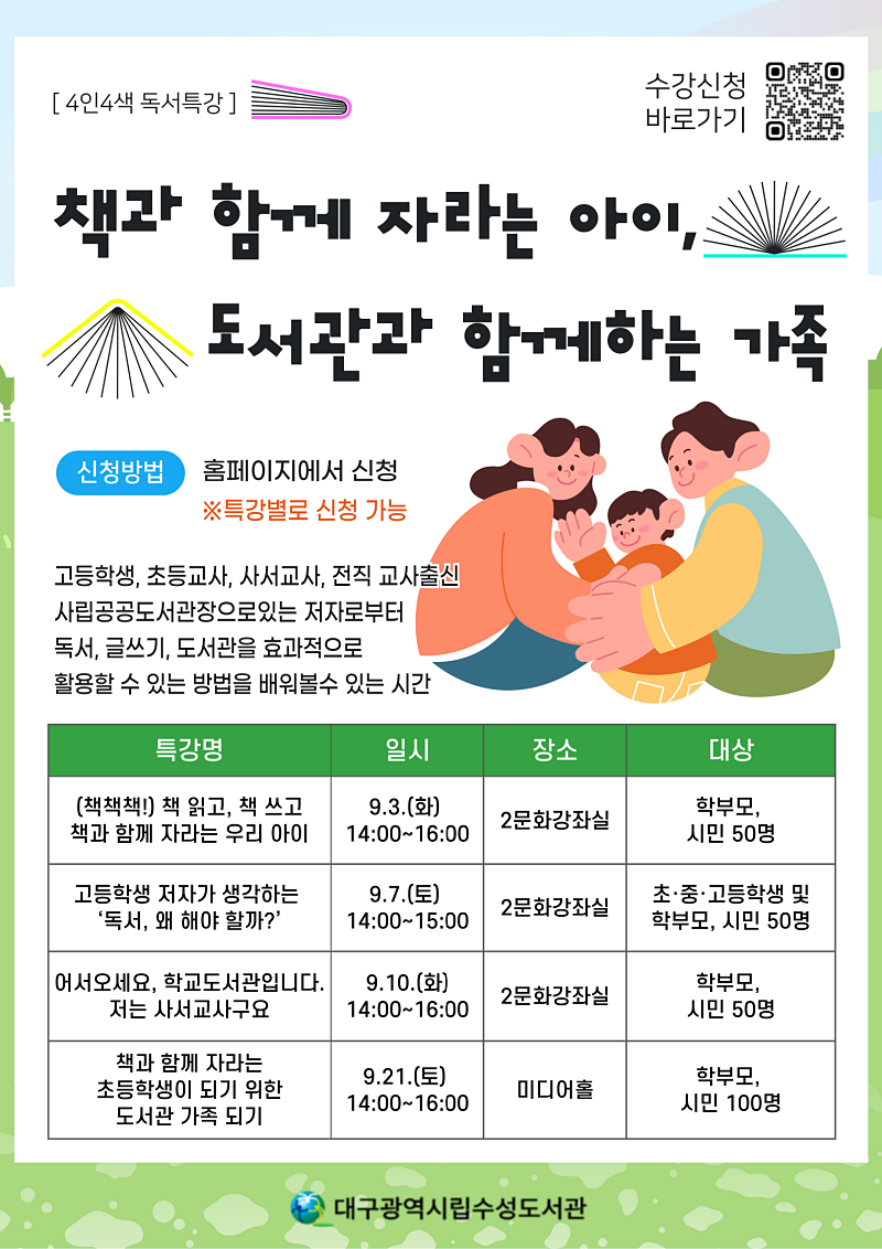 대구수성도서관은 9월 3일(화)부터 9월 21일(토)까지 ‘책과 함께 자라는 아이, 도서관과 함께하는 가족’이라는 주제로 학생·교원 저자들이 독서와 글쓰기, 도서관 활용에 대한 다양한 방법과 실천법에 대한 강연을 개최한다.