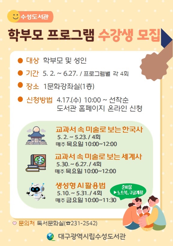 대구수성도서관은 학부모의 역량 강화 및 평생학습 기회 제공을 위해 5월 2일(목)부터 6월 27일(목)까지 학부모를 위한 자녀교육 프로그램을 운영한다.