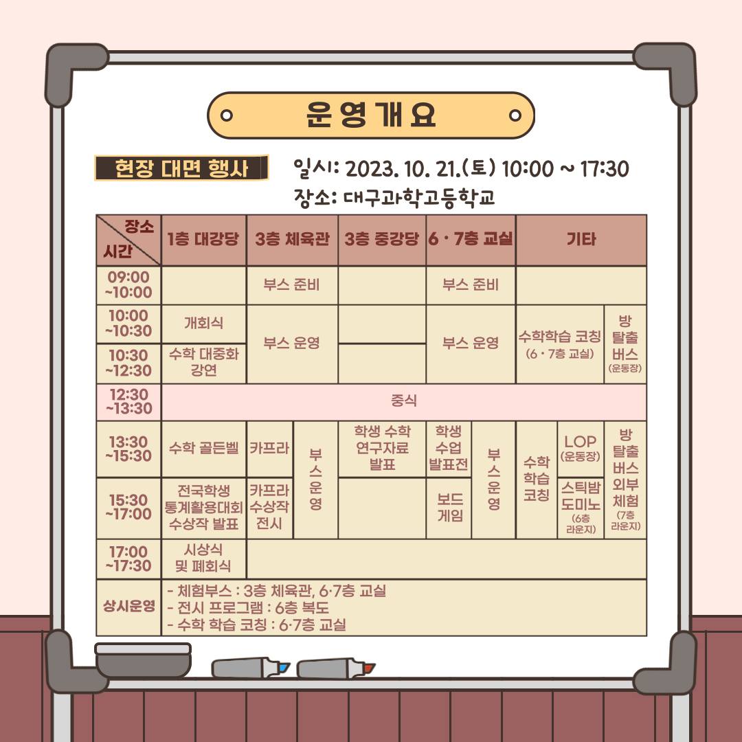 그리고, 수학 대중화 강연 내용을 토대로 제시되는 문제를 해결하는 수학 골든벨, 스틱을 창의적으로 조립ㆍ연결해 만드는 스틱밤 도미노 등의‘수학 이벤트’와 수학나눔학교, 수학점핑학교, 수학동아리 등의 우수사례를 전시하고 학습활동의 결과물을 공유하는 ‘수학교육활동 나눔 전시 프로그램’도 운영된다.