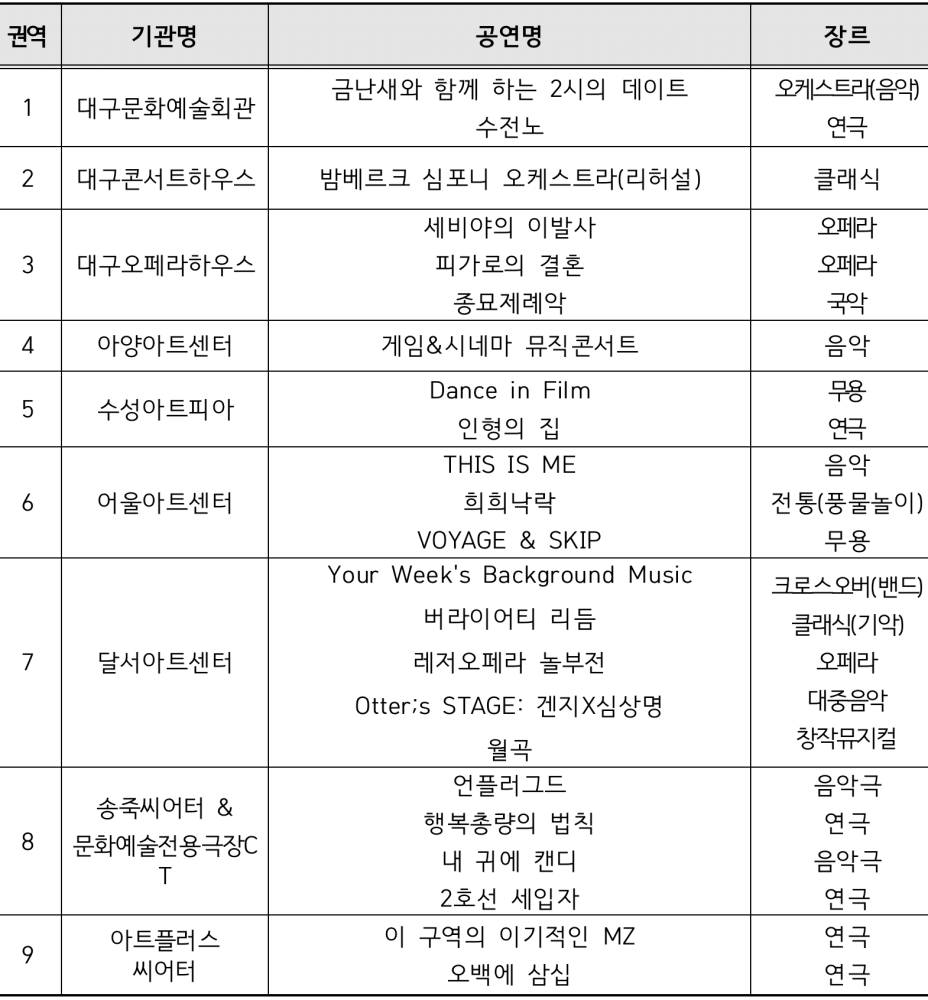 대구시교육청은 올해 지역의 10개 문화예술공연기관과 업무협약을 체결하고, 이 중 9곳에서 운영하는 23개 작품과 관내 고등학교의 창의적체험활동을 연계하여 1교 1작품 관람을 추진한다. 특히, 올해 참여하는 지역 문화예술공연기관이 7곳에서 9곳으로 2곳이 추가되어 총 21,500여 명의 학생들에게 더욱 다양하고 풍성한 공연 체험을 지원할 계획이다.