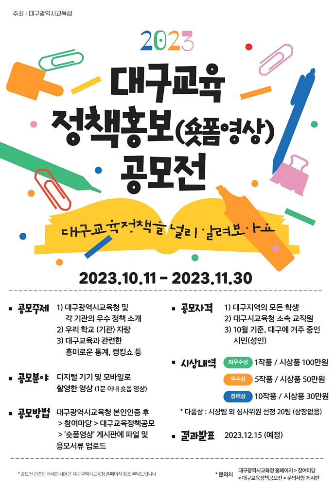 대구시교육청은 대구교육 정책에 대한 학교 구성원들과 시민들의 관심과 참여를 높이기 위해 ‘2023년 대구교육 정책홍보 공모전’을 개최한다.