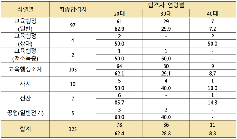 지난 6월 22일(토) 필기시험과 8월 9일(금) 면접시험을 거쳐 최종 합격한 인원은 총 120명으로, 모집구분별 합격자수는 ▲교육행정(일반) 101명, ▲교육행정(장애) 4명, ▲교육행정(저소득) 2명, ▲사서 9명, ▲운전 4명이다.
