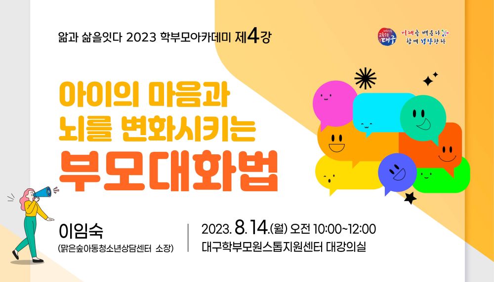 대구시교육청은 오는 8월 14일(월) 오전 10시, 대구학부모원스톱지원센터(대구미래교육연구원 內)에서 ‘2023. 학부모아카데미 제4강’을 운영한다.