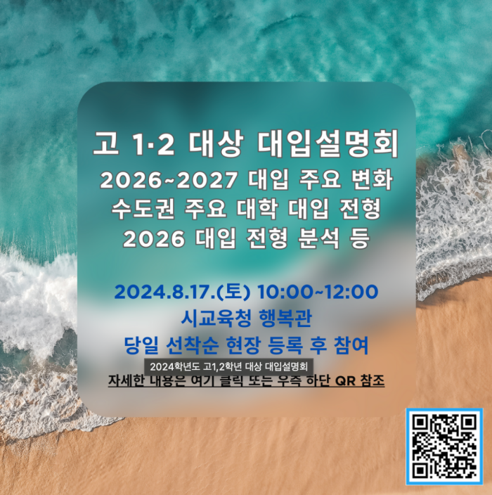 대구시교육청은 8월 17일(토) 오전 10시부터 시교육청 행복관에서 현재 고 1·2 학생, 학부모, 교사 등을 대상으로 토크 콘서트 형식의 대입 설명회를 개최한다.