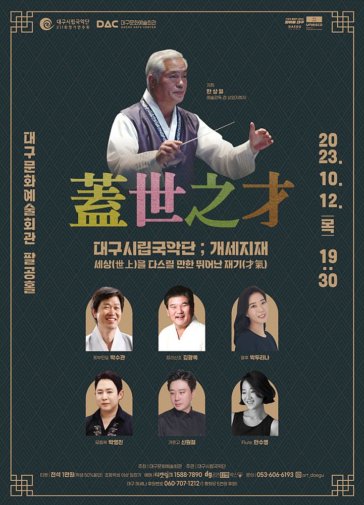 대구시립국악단 제211회 정기연주회 <개세지재蓋世之才>가 10월 12일(목) 오후 7시 30분 대구문화예술회관 팔공홀에서 열린다. 이번 연주회는 피리, 얼후, 모듬북, 거문고와 플릇 등 다양한 협연곡을 국악명인들이 펼쳐 보이며, 대구시 무형문화재인 동부민요의 대표곡들 또한 무대에 올린다.