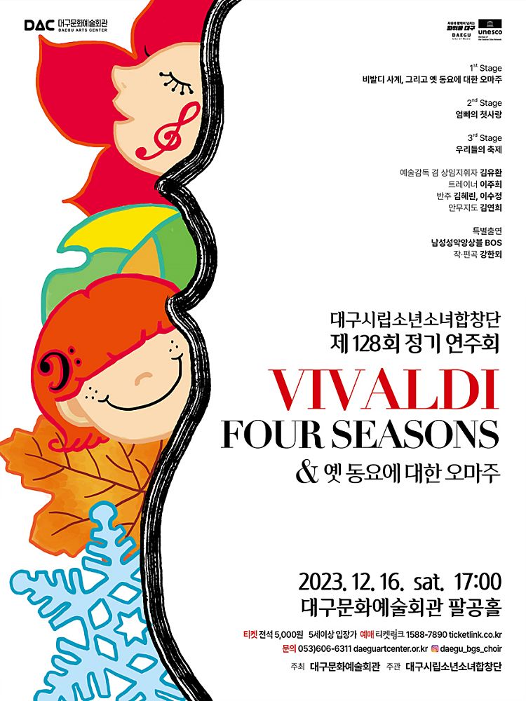 대구시립소년소녀합창단 제128회 정기연주회 ‘비발디 사계, 그리고 옛 동요에 대한 오마주’는 5세 이상 관람가로, 관람료는 전석 5,000원이다. 예매처는 티켓링크(1588-7890), 문의처는 시립소년소녀합창단(053-606-6311)이다.