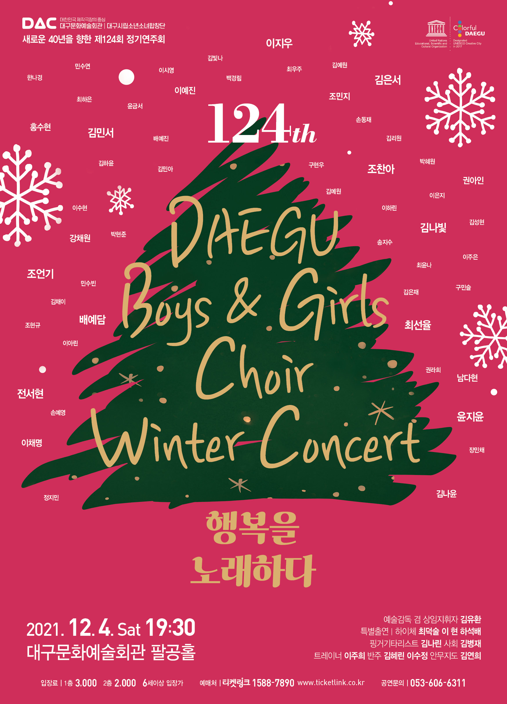 대구시립소년소녀합창단(예술감독 겸 상임지휘자 김유환)의 제124회 정기연주회 '행복을 노래하다'가 오는 12월 04일(토) 19:30 대구문화예술회관 팔공홀에서 개최된다.