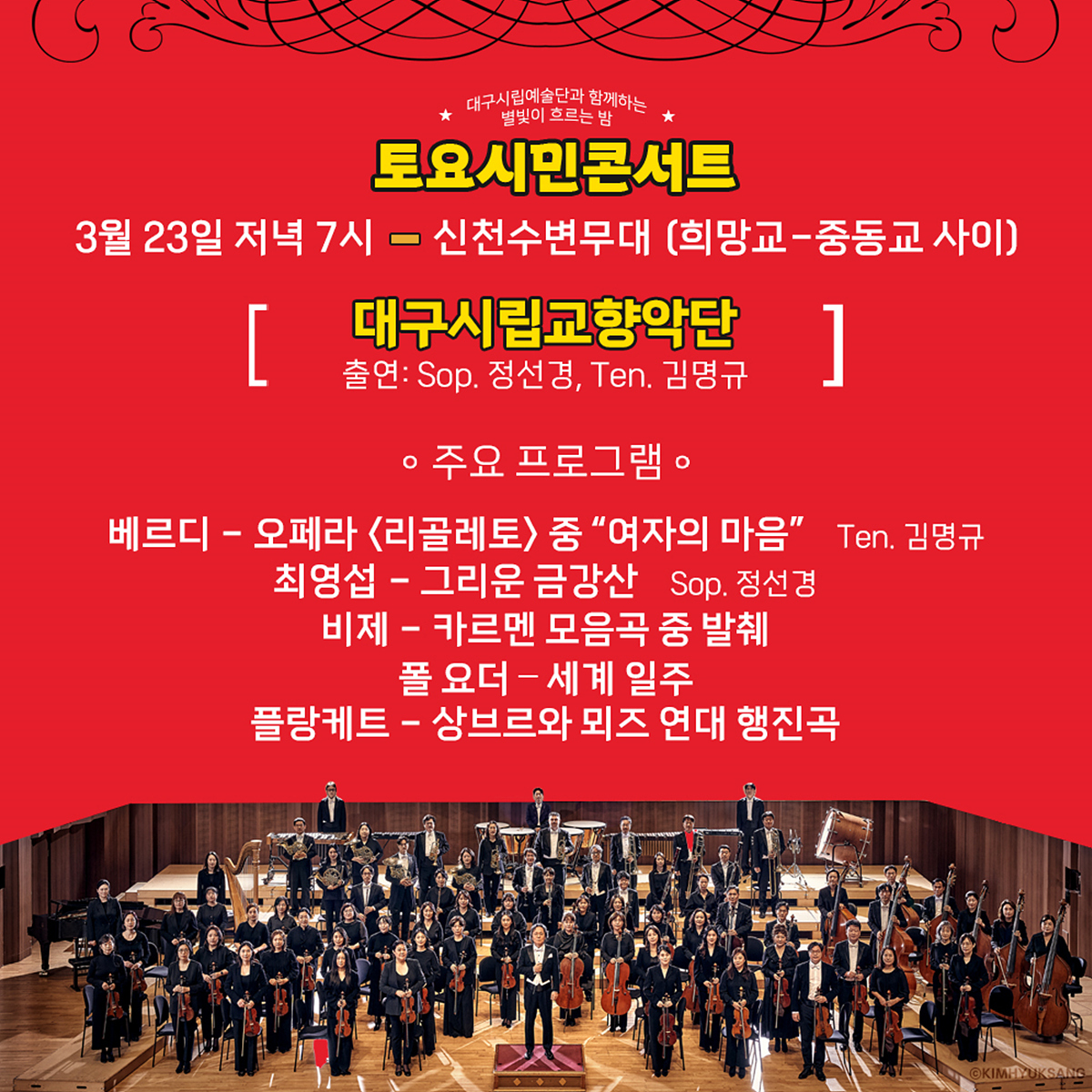 대구광역시는 대구시립예술단의 일상생활 속 시민과 함께 하는 공연을 통해 시민에게 즐거움을 선사하고, 문화와 예술로 지역에 활력을 부여하기 위한 ‘토요시민콘서트’의 첫 공연을 3월 23일(토) 오후 7시, 신천 수변무대와 동성로 관광안내소 앞에서 동시에 펼친다.