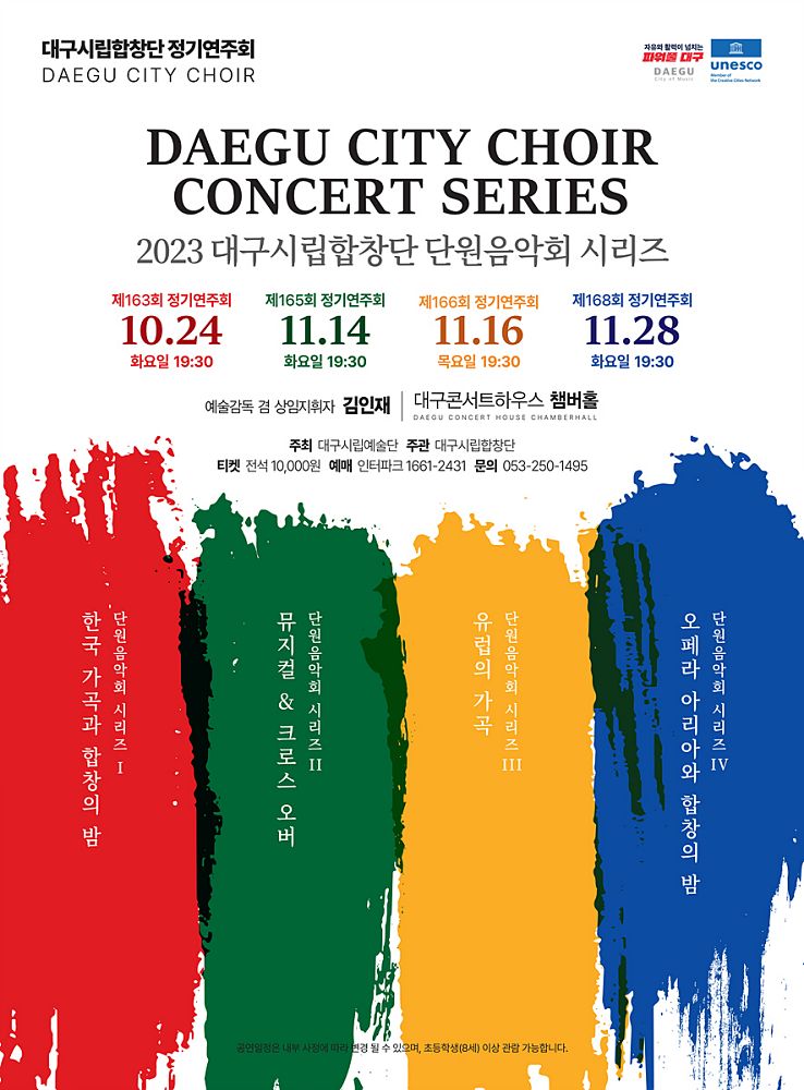 첫 공연은 오는 10월 24일(화) 19:30 대구콘서트하우스 챔버홀에서 만나볼 수 있다. 대구시립합창단 제163회 정기연주회 <한국 가곡과 합창의 밤>을 부제로 정겨운 가곡으로 한국의 사계절과 잔잔하면서도 서정적인 곡들로 가을밤을 물들인다.