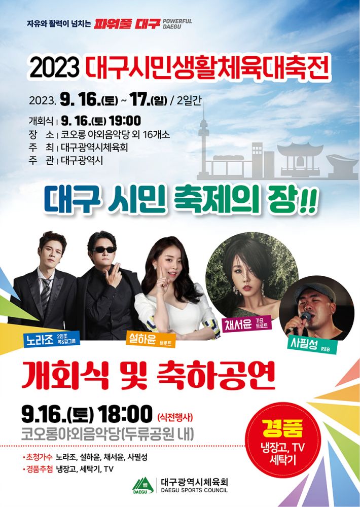 지역 생활체육 동호인들의 최대 축제*인 ‘2023 대구시민생활체육대축전’이 9월 16일(토) 개회식을 시작으로 이틀간 시민체육관을 비롯한 대구 각지의 14개 경기장에서 개최된다.