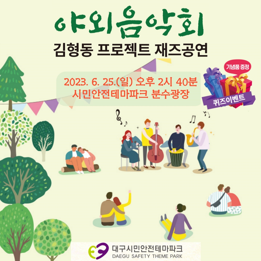 대구문화예술진흥원과 협업한 이번 야외 음악회는 재즈의 숨은 매력을 알리고, 시민안전테마파크를 방문한 시민들을 위해 공연 시작 전 퀴즈 이벤트를 진행하여 기념품도 선물할 계획이다.