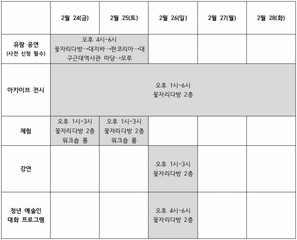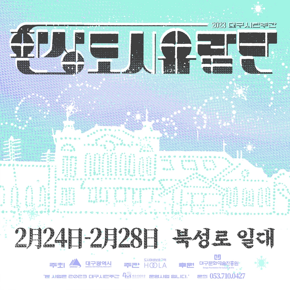 2월 24일(금)부터 28일(화)까지 열리는 이 행사는 2023 대구시민주간을 맞아 대구시와 청년 단체(훌라, 대표 안진나), 청년 예술가들이 협업해 근대 문화공간과 이야기를 매개로 재창작한 작품을 선보이는 시민 답사·체험 프로그램이다.