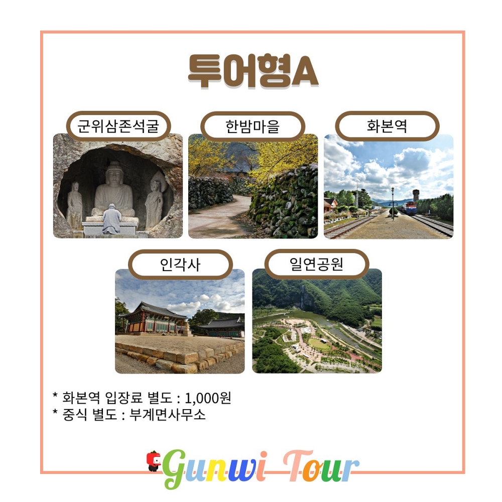 ※ 투어형 코스 1: 청라언덕역→동대구역→군위삼존석굴→한밤마을→부계면(중식)→화본역→인각사&군위댐,일연공원→동대구역→청라언덕역