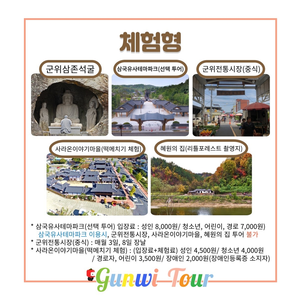 ※ 체험형 코스: 청라언덕역→동대구역→군위삼존석굴→삼국유사테마파크(하차)→군위전통시장(중식)→사라온이야기마을(떡메치기)→혜원의 집(리틀포레스트 촬영지)→삼국유사테마파크(승차)→동대구역→청라언덕역