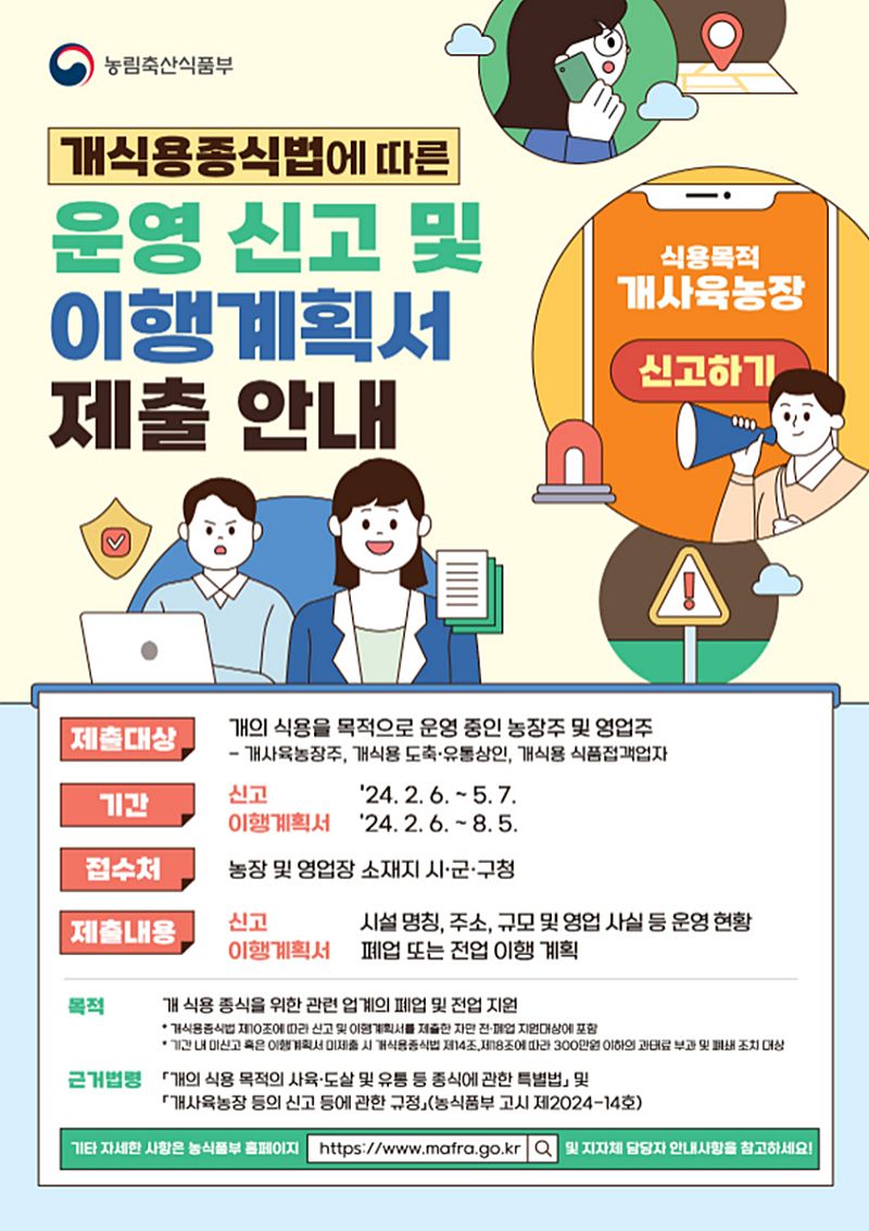 또한, 농식품부에서도 개농장·도축장 민원사항 대응 및 담당부서 안내를 위한 콜센터(1577-0954, 평일 오전 9시~오후 6시)를 운영 한다.