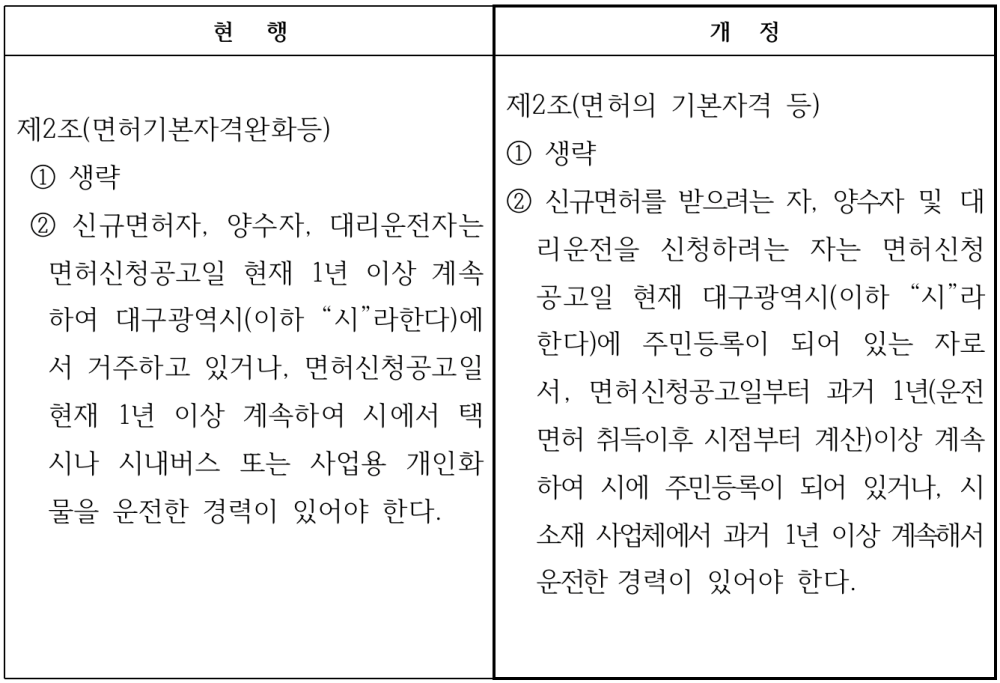 이러한 문제를 해결하기 위한 개정된 규정의 주요 내용을 살펴보면, 신규면허를 받으려는 자, 양수자 및 대리운전을 신청하려는 자는 면허신청공고일부터 과거 1년(운전면허 취득이후 시점부터 계산) 이상 계속하여 시에 주민등록이 되어 있으면 양수할 수 있도록 거주규정을 완화했다.