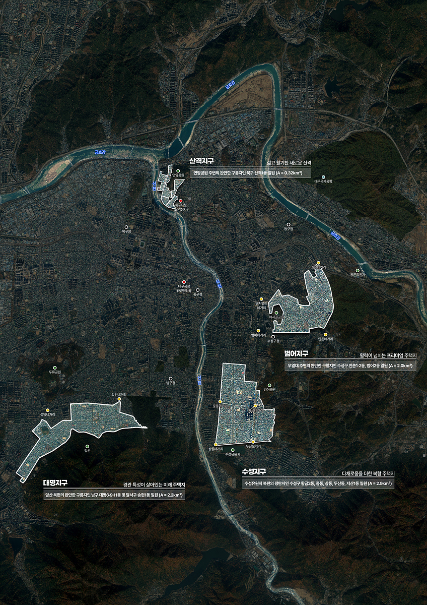 * 대규모 노후 주택지(4개 지구 7.42㎢) : 범어(2.0㎢) / 수성(2.9㎢) / 대명(2.2㎢) / 산격(0.32㎢)