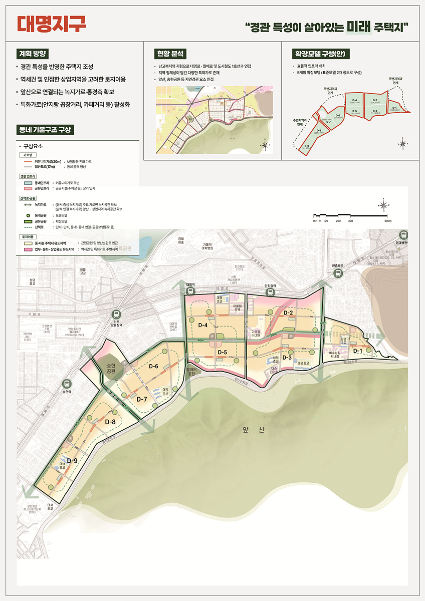 대명지구는 ‘경관 특성이 살아있는 미래 주거지’로 앞산으로 이어지는 녹지·경관축을 살리고 안지랑 곱창거리·앞산 카페거리 등의 특성을 극대화해 주변과 조화롭게 개발될 수 있도록 했다.