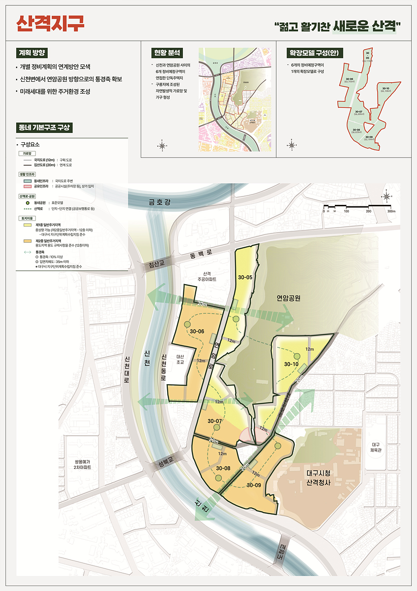 마지막으로 산격지구는 ‘젊고 활기찬 새로운 산격’이 될 수 있도록 신천에서 연암공원으로 이어지는 통경축을 확보해 미래 세대를 위한 주거환경으로 조성될 수 있도록 했다.
