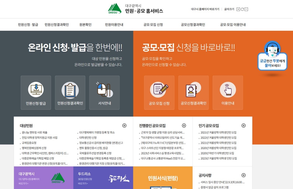 대구시는 그 간 시 본청과 사업소에만 제공되던 ‘민원·공모 홈서비스’, ‘공모·모집’ 온라인 서비스를 2023. 3월부터 구·군까지 확대 운영한다. (https://minwon.daegu.go.kr)