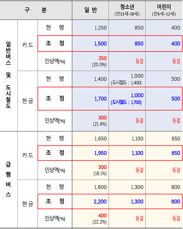 이번 대중교통 요금조정으로 ’24년 1월 13일(토)부터 교통카드를 사용하는 일반인 기준 시내버스· 도시철도 요금은 1,250원에서 1,500원, 급행버스는 1,650원에서 1,950원으로 인상되며, 현금 이용 시 시내버스·도시철도는 1,400원에서 1,700원, 급행버스는 1,800원에서 2,200원으로 인상된다. 어린이와 청소년 요금은 동결해 현행과 같다.