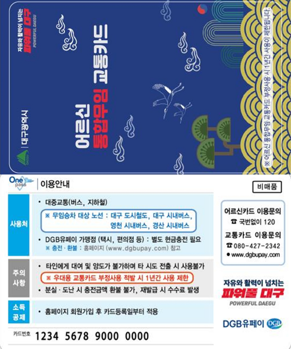 대구시는 전국 최초로 7월 1일부터 어르신의 교통복지를 확대한 ‘어르신 대중교통(도시철도+시내버스) 무임교통 통합 지원’을 실시하며, 이를 위해 5월 16일부터 주소지 읍·면·동 행정복지센터에서 통합 무임교통카드를 발급한다.