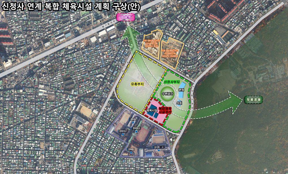 둘째, 이러한 두 개의 문화체육시설을 건립하기 위해 신청사 건립 예정부지는 당초 68,000㎡에서 78,000㎡로 10,000㎡ 확대되고 반면에 매각대상 유휴부지는 당초 90,000㎡에서 80,000㎡로 10,000㎡ 축소된다. 이는 전임시장 시절 추진된 신청사 건립계획의 부지면적과 동일하다.