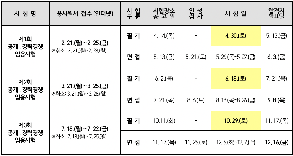4월 30일 간호8급 등 4개 직류를 대상으로 제1회 공개·경력경쟁임용 필기시험이 시행되고, 6월 18일 행정9급 등 18개 직류의 제2회 공개·경력경쟁임용 필기시험이 시행된다. 그리고 10월 29일에는 행정7급과 기술계 고졸 등 9개 직류에 대해 제3회 공개·경력경쟁임용 필기시험이 시행된다.