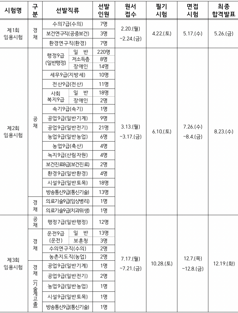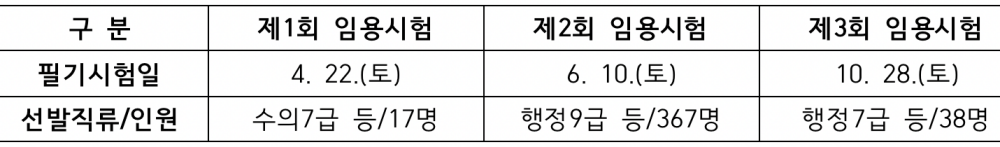 제1회 임용 필기시험은 수의7급 등 3개 직류를 대상으로 4월 22일(토) 시행되고, 6월 10일(토) 행정9급 등 15개 직류의 제2회 임용 필기시험이 시행된다. 그리고 제3회 임용 필기시험은 행정7급과 기술계 고졸 등 9개 직류에 대하여 10월 28일(토) 시행된다.