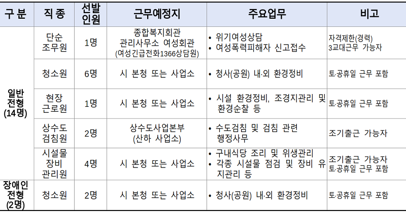 이번 채용시험은 단순조무원 1명, 상수도검침원 2명, 청소원 8명 등 총 5개 직종, 16명*을 선발할 계획이며, 유연한 인력 운용을 위해 직종별 통합 선발 후 부서 결원상황과 근로자의 거주지 및 경력 사항 등을 고려하여 시 본청 또는 산하 사업소 등 적재적소에 배치할 예정이다.