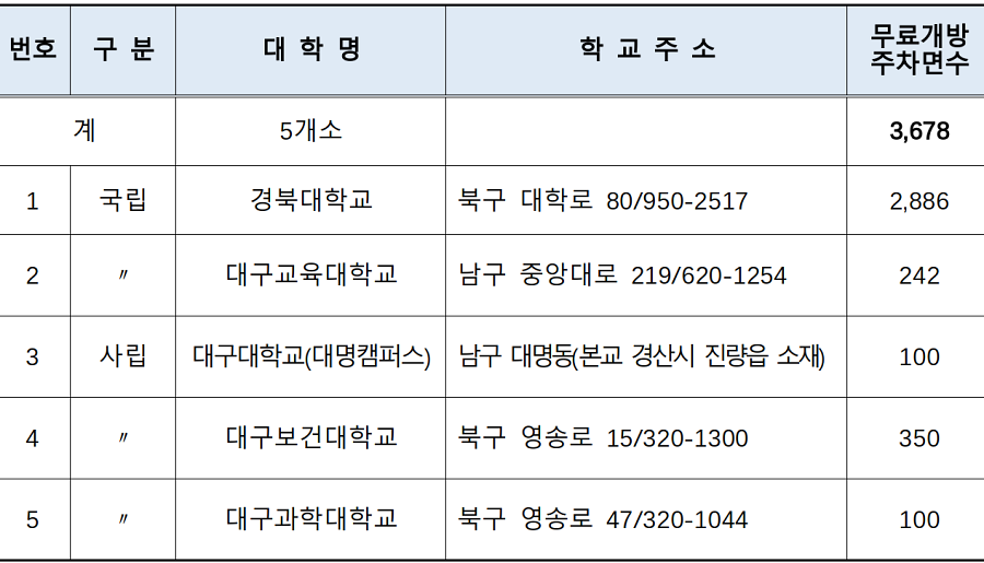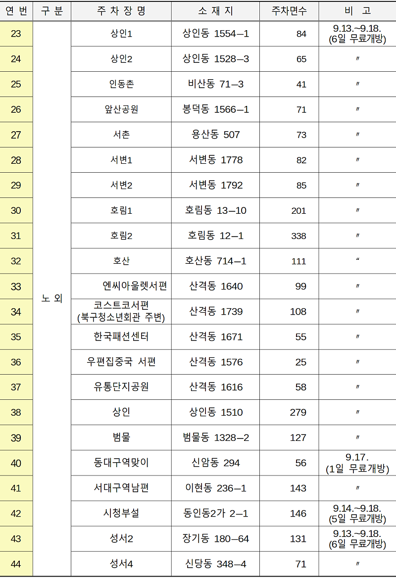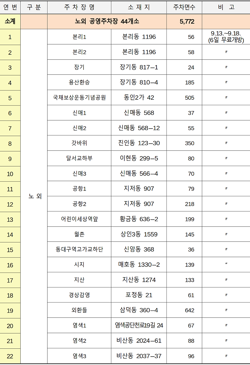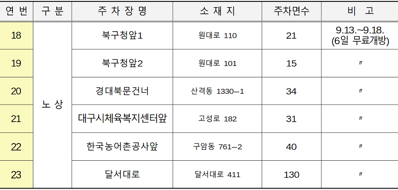 추석 연휴기간 주차편의 제공을 위해 대구시가 운영하는 공영주차장 89개소(8,817면)를 9월 13일(금)부터 개방하고, 구·군 공영주차장 및 공공기관 부설주차장(31,399면)은 9월 14일(토)부터 9월 18일(수)까지 개방해 전체 733개소 40,216면을 무료 개방할 예정이다.