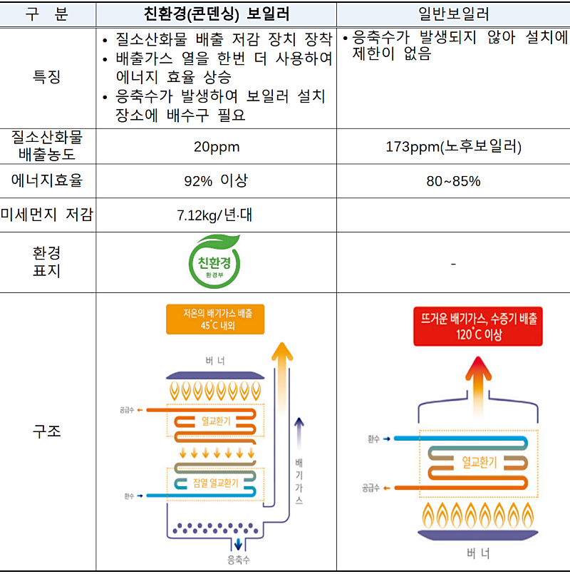 친환경 보일러란 표시가스 소비량 70kW 이하인 콘덴싱 가스보일러로 한국환경산업기술원의 환경표지 인증을 받은 제품을 뜻하며, 인증현황은 온라인(www.ecosq.or.kr/boiler)으로 조회 가능하다.