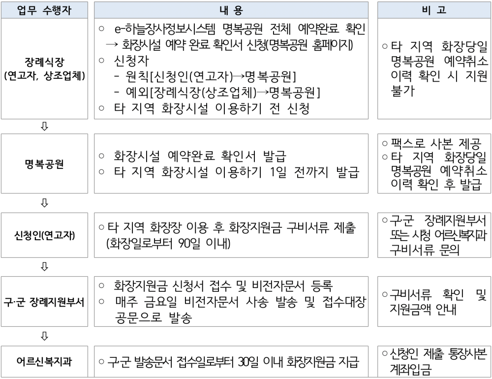 ‣ 신청기간/신청자격 : 화장일로부터 90일 이내 / 사망자의 연고자
