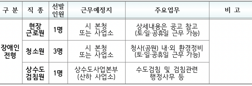 현장근로원 1명, 청소원 3명, 상수도검침원 1명 등 총 3개 직종을 선발할 계획이며, 탄력적 운영을 위해 직종별로 통합해 선발한 후 부서 결원상황과 근로자의 거주지 및 경력사항 등을 고려해 시 본청 또는 산하 사업소에 배치할 예정이다.