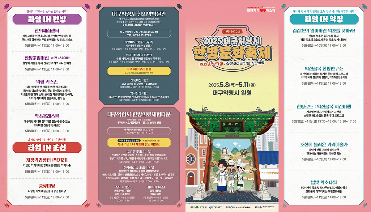 대구광역시는 대한민국 대표 한방문화축제인 ‘2025 대구약령시 한방문화축제’를 ‘잇츠 한방타임, 약령시로 떠나는 시간여행’이라는 주제로 오는 5월 8일(목)부터 11일(일)까지 대구약령시 일원에서 개최한다.