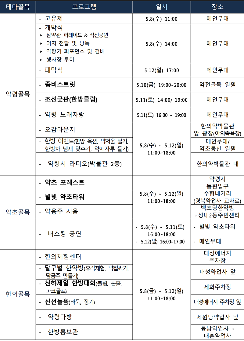 축제기간 5일 동안에는 약령시 한방문화를 경험할 수 있는 다양한 프로그램들이 5가지 테마골목을 중심으로 진행된다.