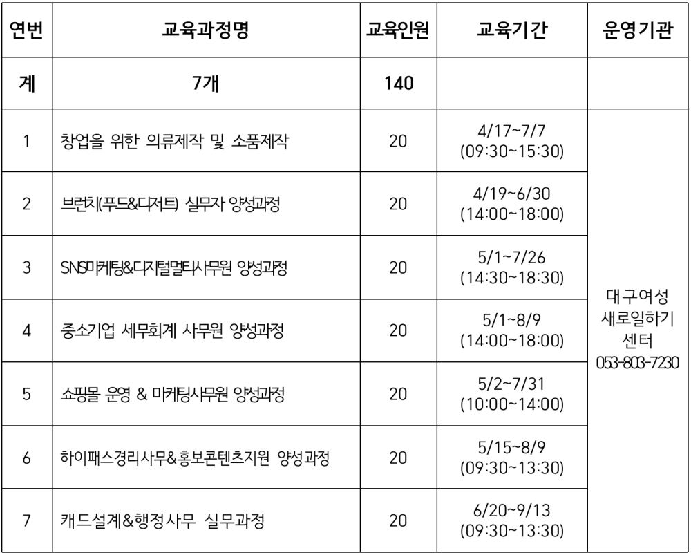 대구시 도시관리본부 대구여성새로일하기센터에서는 구인수요가 높은 취업 직종에 대한 직업교육훈련과정 통해 경력단절여성의 취업 역량을 강화하고 지역사회 및 산업체 요구에 적합한 여성인력 양성하는 직업훈련과정을 운영해 오고 있다.