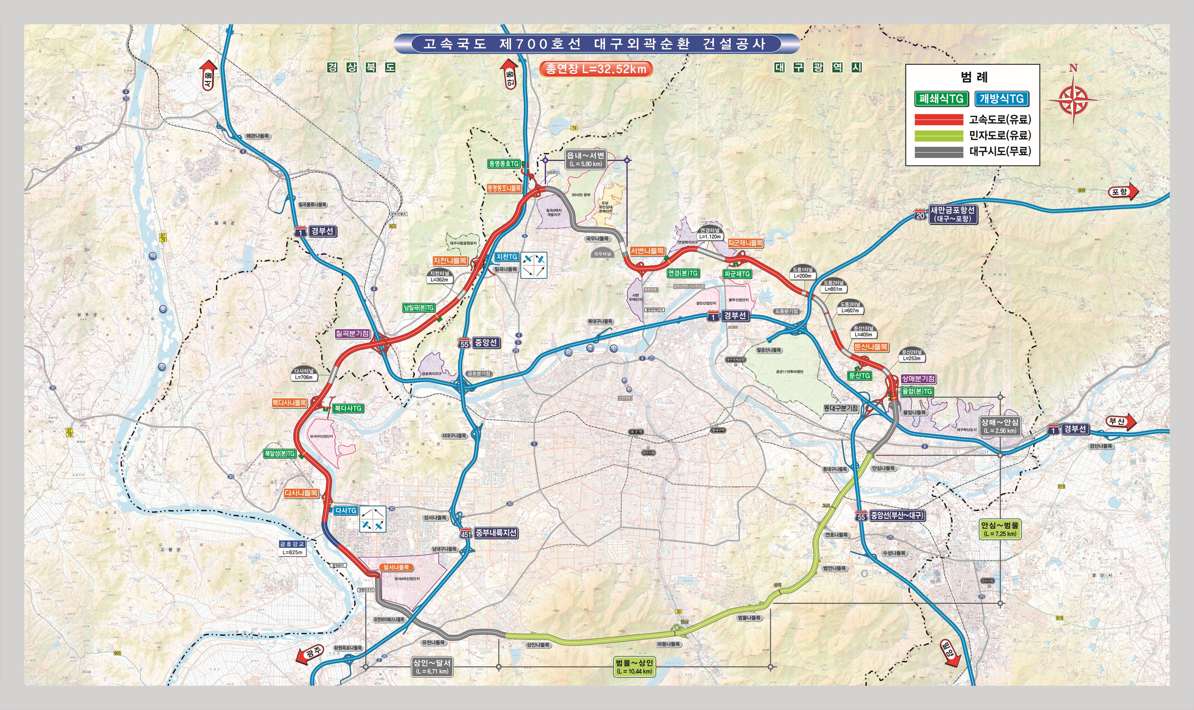 이번에 완료되는 구간은 달서~동명․동호, 서변~상매구간으로 나들목 8개소(달서, 다사, 북다사, 지천, 동명․동호, 서변, 파군재, 둔산)와 분기점 2개소(칠곡, 상매)로, 경부고속도로와 중앙고속도로, 대구부산고속도로, 대구를 지나는 주요 국도와도 연결된다.