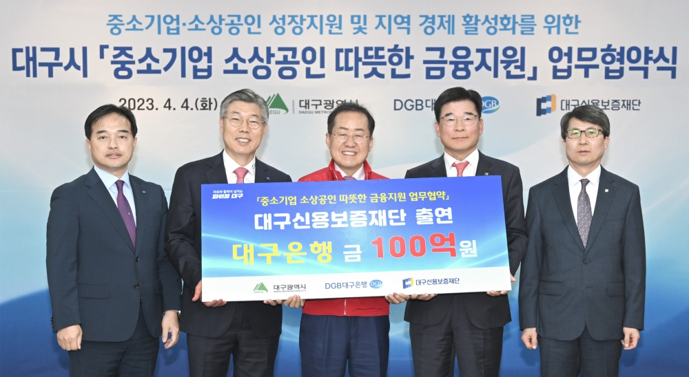 대구광역시와 (주)대구은행(이하 은행), 대구신용보증재단(이하 재단)은 2023년 4월 4일(화)에 지역 중소기업·소상공인 성장을 지원하기 위해 ‘대구광역시 중소기업 소상공인 따뜻한 금융지원 업무협약’을 체결했다.
