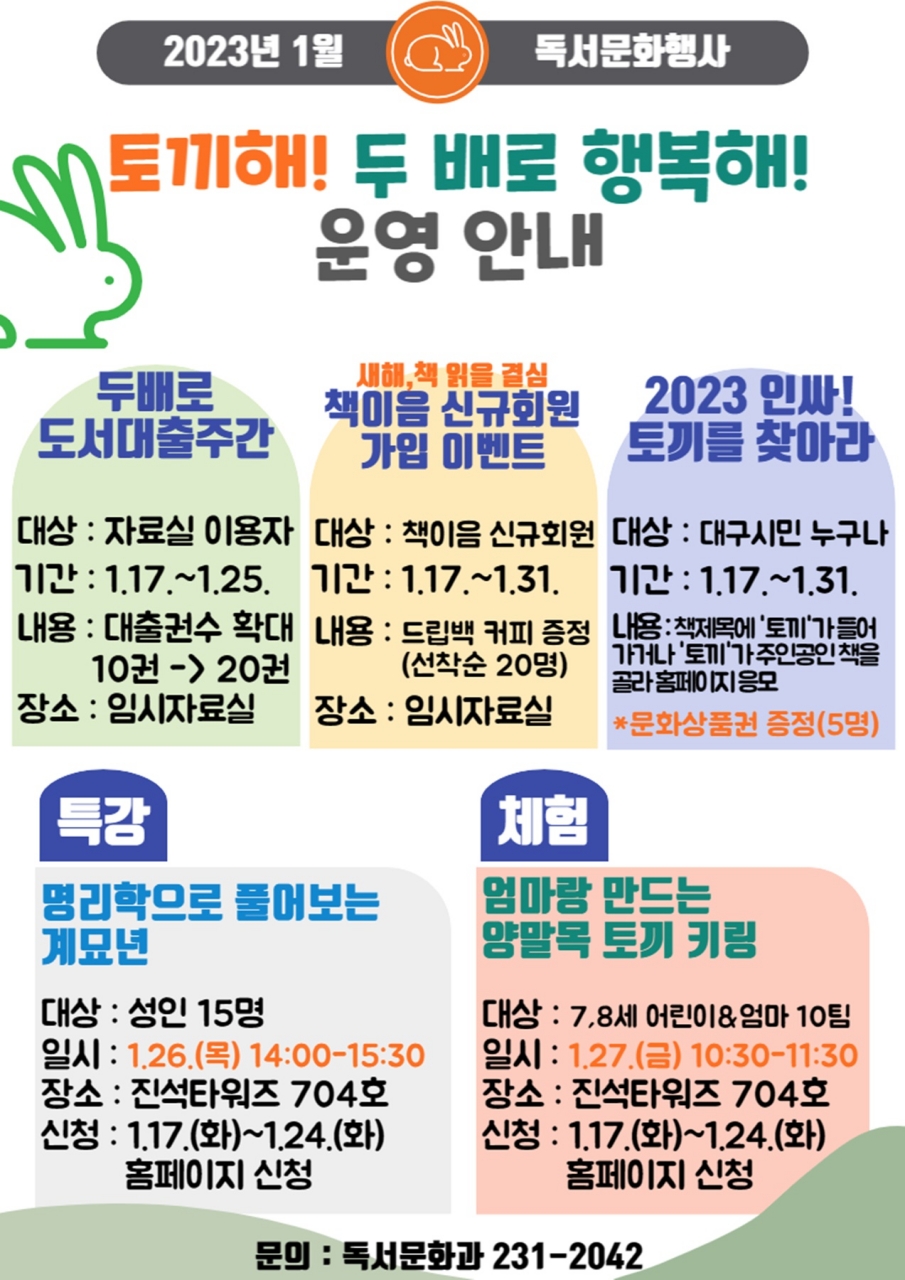 대구중앙도서관은 계묘년 새해를 맞이해 오는 1월 17일(화)부터 31일(화)까지 『토끼해, 두배로 행복해』 행사를 운영한다.