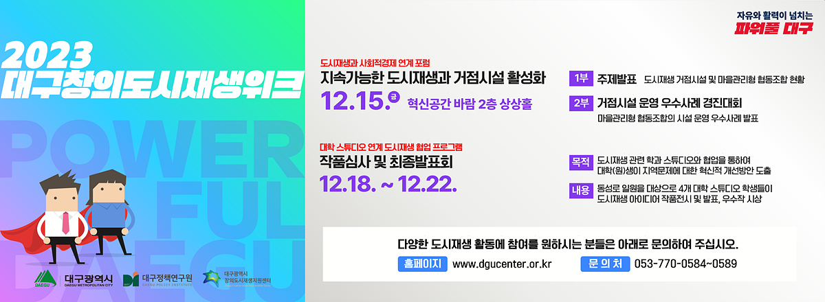 대구광역시와 대구창의도시재생지원센터는 도시재생 주요 현안을 논의하고 대구형 도시재생의 비전 및 방향성을 제시하기 위한 ‘2023 대구창의도시재생위크’를 개최한다.