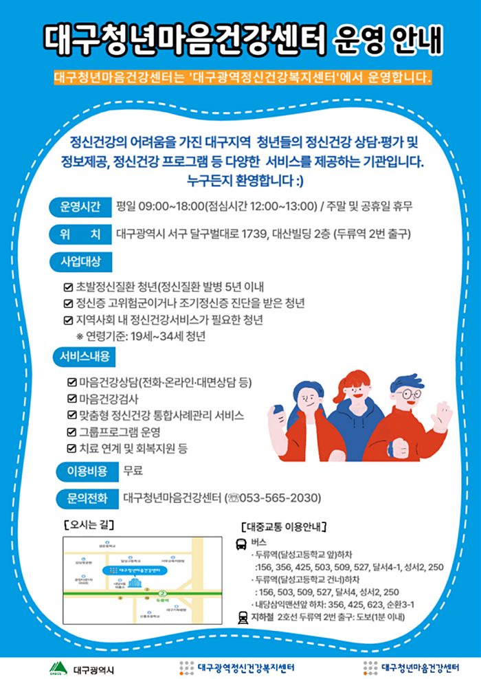 서구 내당동(두류역 2번 출구)에 위치한 대구청년마음건강센터는 정신건강의 어려움을 겪는 19세~34세 청년 누구든지 무료로 이용할 수 있으며, 이용 문의는 전화(☏053-565-2030) 또는 인터넷 누리집(www.youthdgmhc.or.kr)을 통해 자세한 내용을 확인할 수 있다.