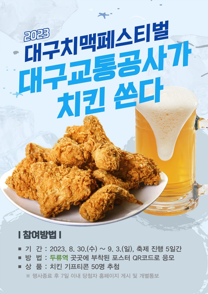 먼저 ‘대구교통공사가 치킨 쏜다’ QR코드 응모 이벤트를 진행한다. 이벤트 참가는 두류역에 부착된 안내 포스터의 QR코드를 통해 응모하면 된다. 무작위 추첨 후 50명에게 치킨 기프트콘을 지급할 예정이다.