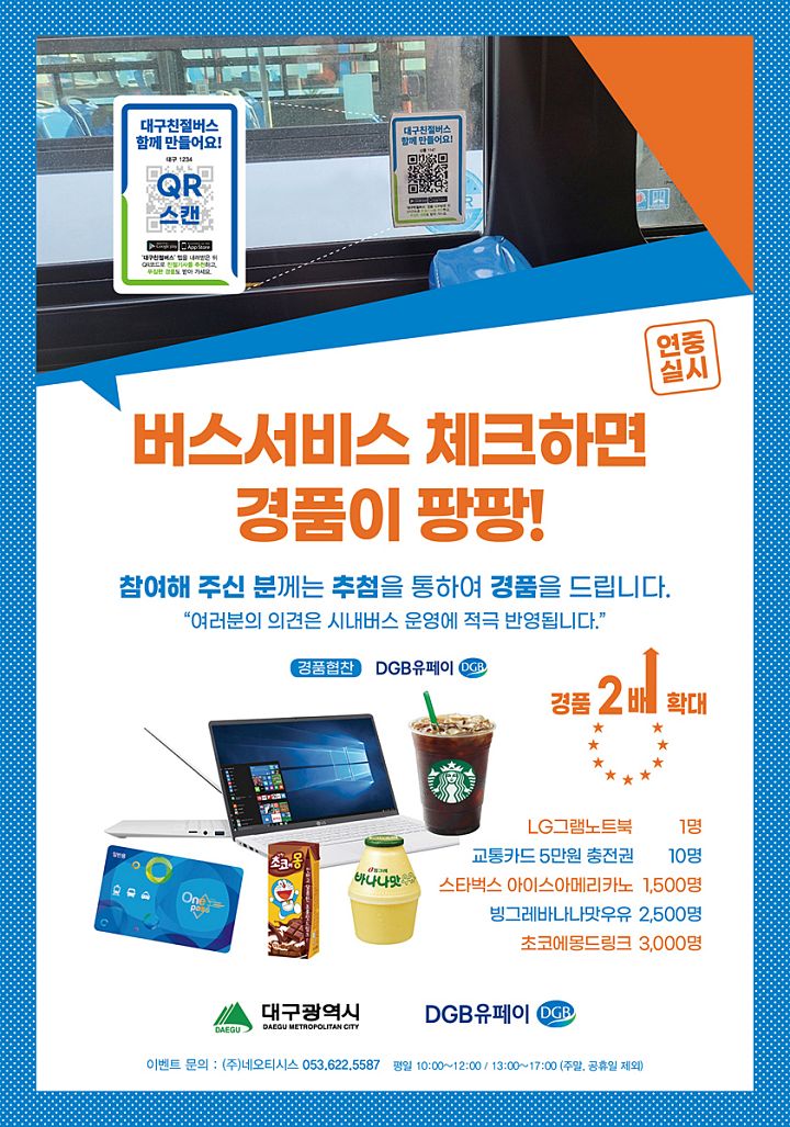 참여를 원하는 시민은 ‘대구 친절버스’ 앱을 설치하고 버스 창문에 부착된 QR코드를 스캔한 후 안전한 승하차, 교통약자 배려, 차량 청결상태 등을 체크하고 이용 후기를 남기면 경품*도 받을 수 있다.